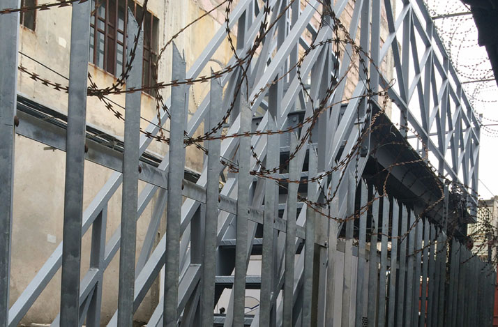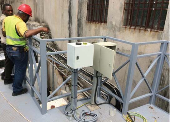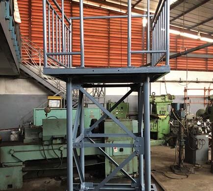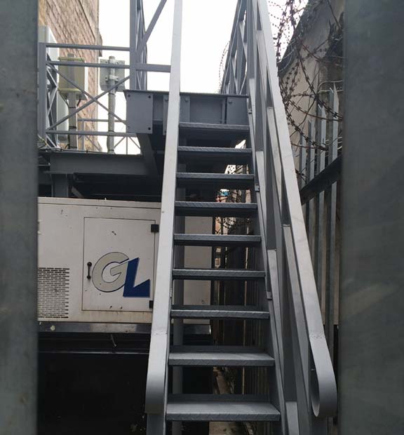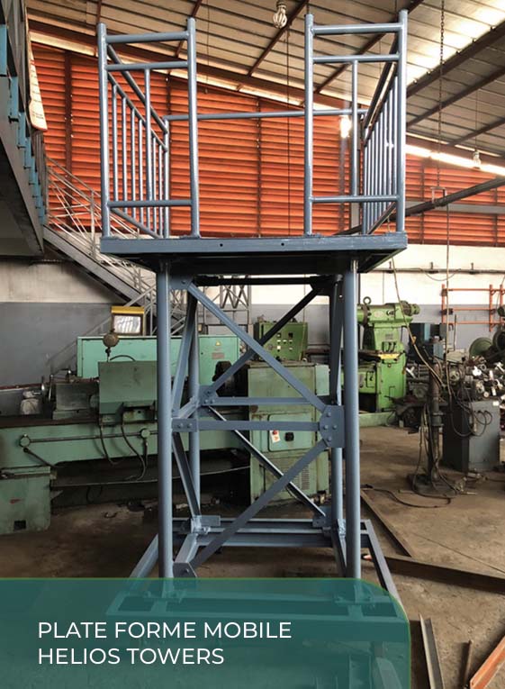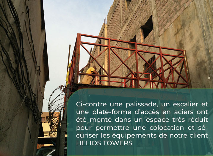 Ci-contre une palissade, un escalier et une plate-forme d’accès en aciers ont été monté dans un espace très réduit pour permettre une colocation et sécuriser les équipements de notre client HELIOS TOWERS